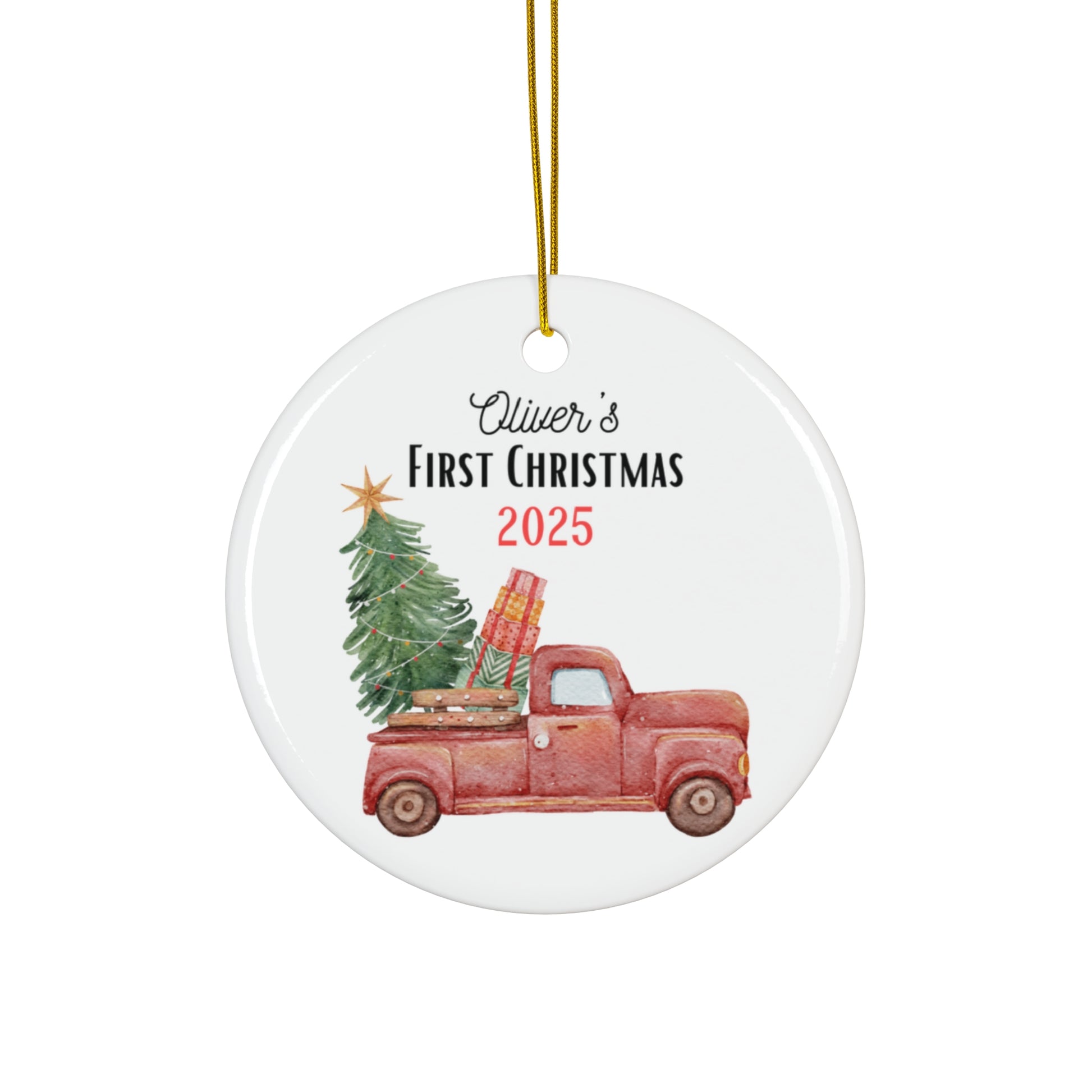 Custom Christmas Ornament is also a perfect thoughtful and heart-touching gift for new parents. The design features a sweet watercolor illustration of a vintage red truck carrying a Christmas tree and gifts, creating a nostalgic and heartwarming holiday feel. Each ornament can be customized with your baby’s name and the year, making it a truly special keepsake to remember this magical milestone.